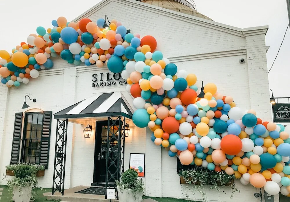 When the Silos Baking Co. at Magnolia turned one, the display and events teams created a display of colorful balloons to celebrate the occasion. Emily was on a team of creatives that inflated all of the balloons, created a base structure on the building and attached all of the balloons one by one with zip ties.